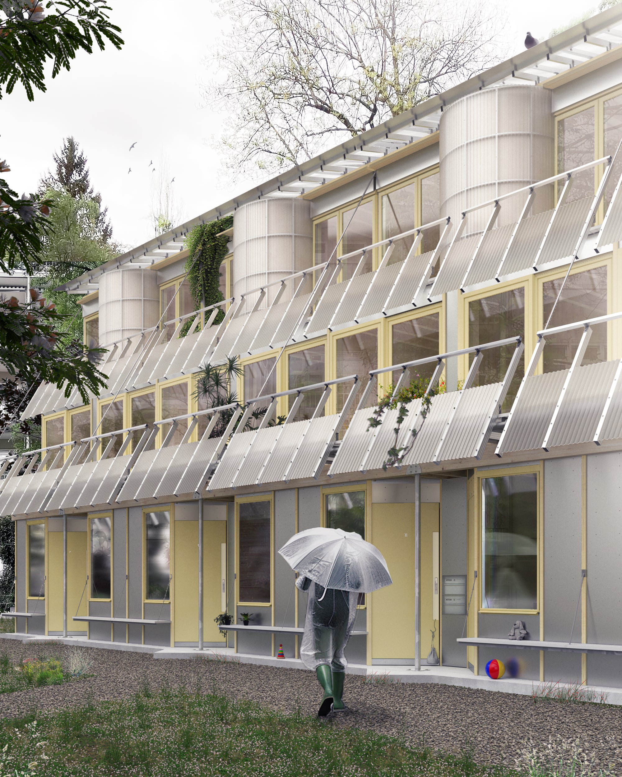 Um den Energieverbrauch im Gebäudesektor zu reduzieren und die aktuelle Wohnungsknappheit zu mildern, wird es immer wichtiger, sich mit den Sanierungen, insbesondere von Fassaden aus den 1960er und 1970er Jahren, zu beschäftigen. Das lineare Anbauen neuer Raumschichten über ganze Fassadenfluchten hinweg schafft neue Raumverbindungen und zeitgemässe Wohntypologien. Neben einer substanziellen energetischen Ertüchtigung entstehen mehr Wohneinheiten mit einer höheren Belegung und weniger Flächenverbrauch pro Kopf. Das klassische Baugerüst, das bei Fassadensanierungen als temporärer Arbeitsraum zum Einsatzkommt, wird zum gestalterischen Ausgangspunkt der eigentlichen Intervention. Der leichte Stahlskelettbau wird mit Windverbänden ausgekreuzt. Der gerüstartige Ausdruck strahlt eine gewisse Leichtigkeit aus und öffnet die Wohnungen zum Landschaftsraum.