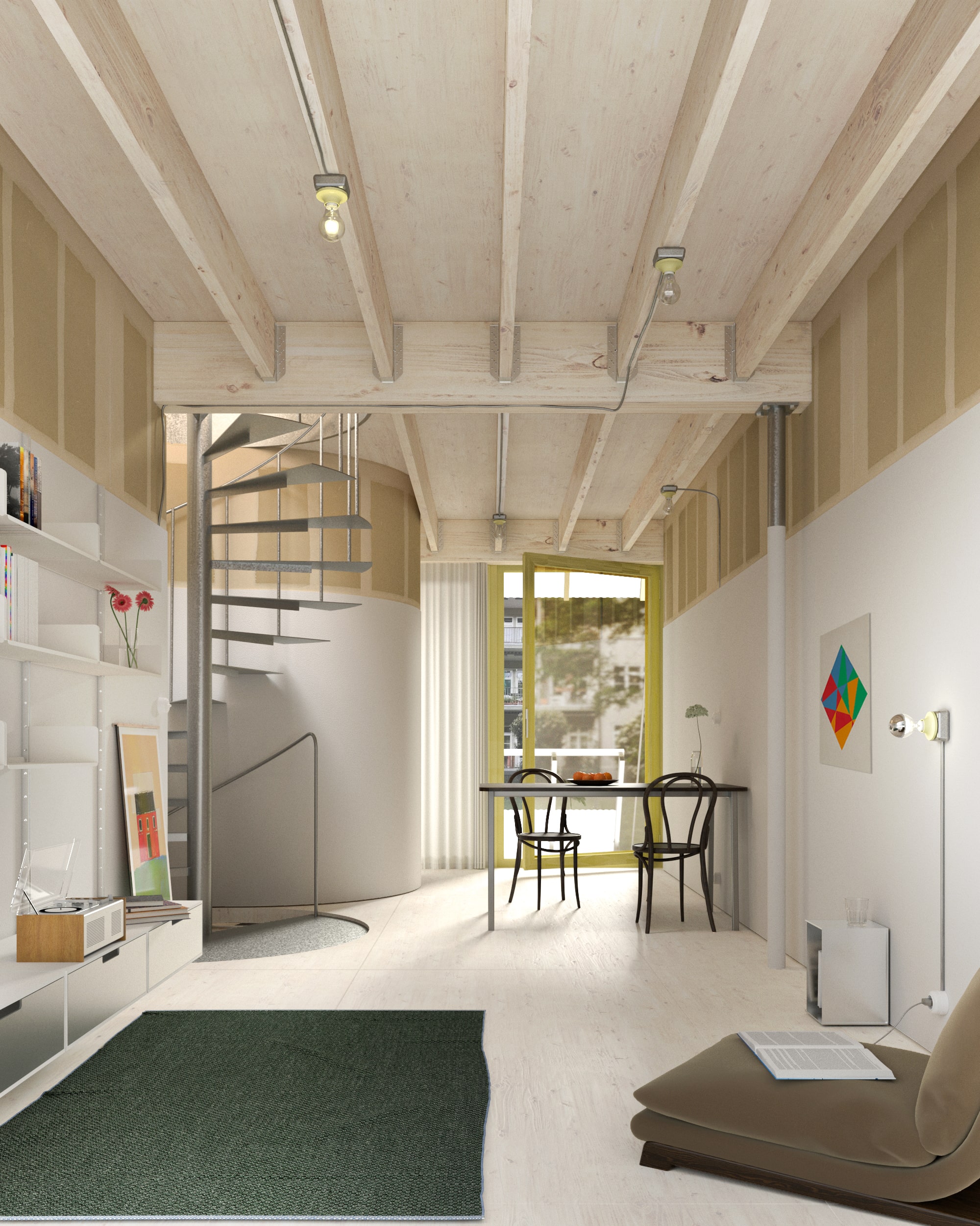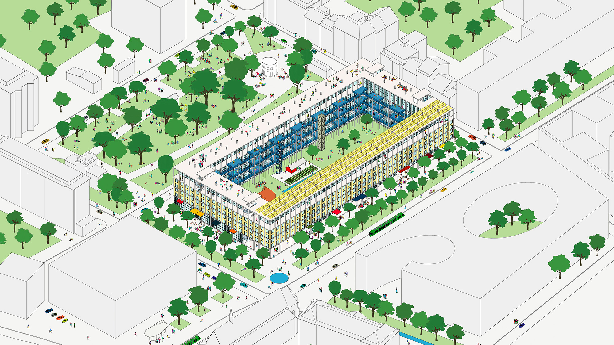 Basler Paradies is a housing co-operative offering approximately 150 double-height residential units, incorporating maisonettes, studios, flat-sharing cooperatives, townhouses, and family flats. Forming a block with shared balconies and terraces, the generous courtyard hosts communal areas such as a woodworking workshop, bicycle atelier, green house, and vegetable garden. Everyone has their own vision of paradise; the project provides the possibilities to build your own. A temple of columns, a structure in its pure sense; the building is based on a grid system, consisting of vertical and horizontal prefabricated elements. Full circle material recycling is envisioned; demolition, separation, production, and construction are all planned to be carried out on-site. Thanks to the structural redundancy of the elements, which allow an open, flexible floor plan design, this results in open, contemporary typologies that encourage further appropriation and adaptation.