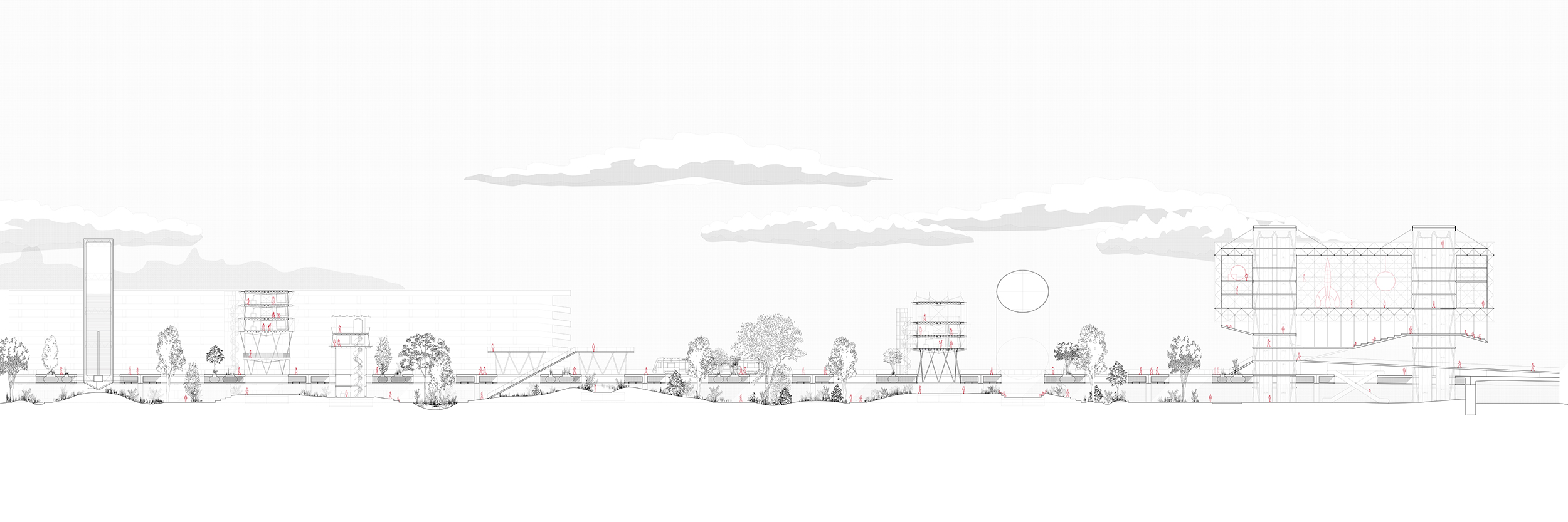 Highwaytopia emerges from the opportunity that the Grenzacherstrasse offers to rethink our perception of highway infrastructure. The Rheintunnel plan allows the decommissioning of a central Basel motorway, inspiring new uses for such milieus. By reducing travel speed, the highway becomes a multifunctional backbone with a tramline, bike path, and pedestrian strip. Subtracting some of the built substance of the highway’s concrete viaducts, which cast a strong shadow, is the genesis for a new type of landscape that rises from beneath the overpass. This new penumbra landscape is defined by the interplay between light and shadows. Small music follies set on the highway replace car noises with music of the community. This parade of follies reflects the ephemeral nature of parades, becoming the new scenography of the highway until future experiments arise from needs that are yet to be known. This research sought opportunities to repurpose underused infrastructure in the realm of the ugly and uncanny.