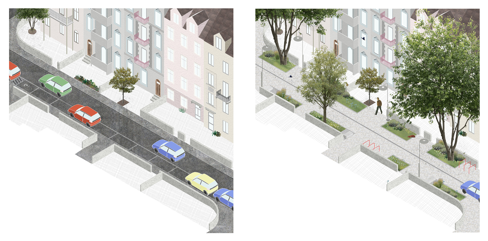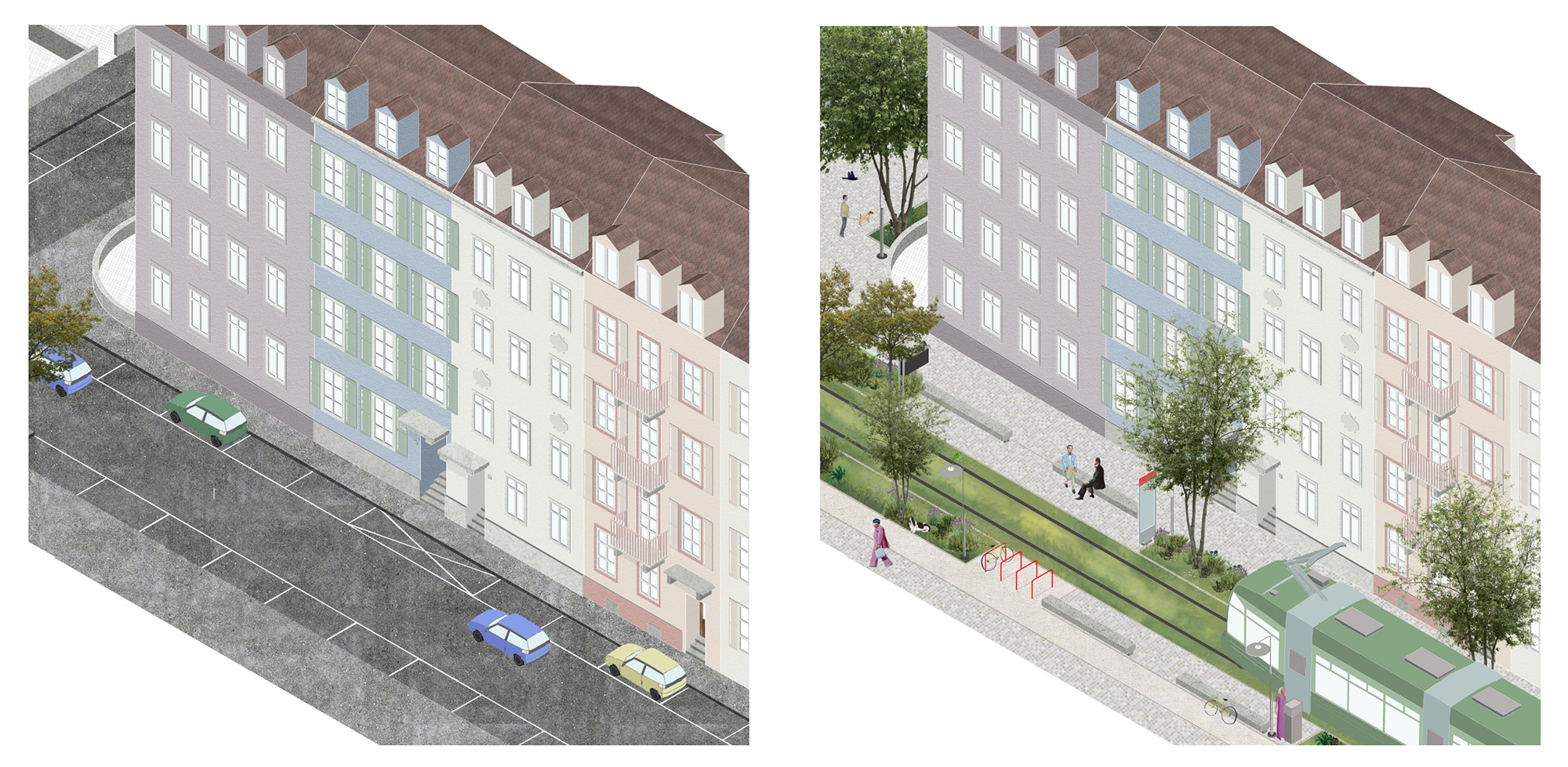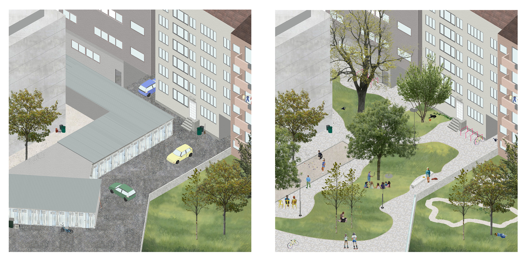 The project, inspired by an anecdote of a tree, a moth, and a bird explores how biodiversity fosters social connection, offering a series of targeted interventions in five urban conditions identified within the Gundeldingen neighbourhood: the primary axis, Güterstrasse, extending to the intersection with Reinacherstrasse; the vertical secondary axes; Tellplatz square and the courtyards of perimeter blocks. For each condition, the project offers a transformation of its urban asset, starting with a change in materiality, a redistribution of green spaces, and a transformation of the street from a space exclusively used for transit to a space for social interactions. The final objective of these proposals is to tackle upcoming temperature issues and their consequences on biodiversity’s survival in densely populated and built environments, while cherishing and protecting Gundeldingen’s urban unicity.