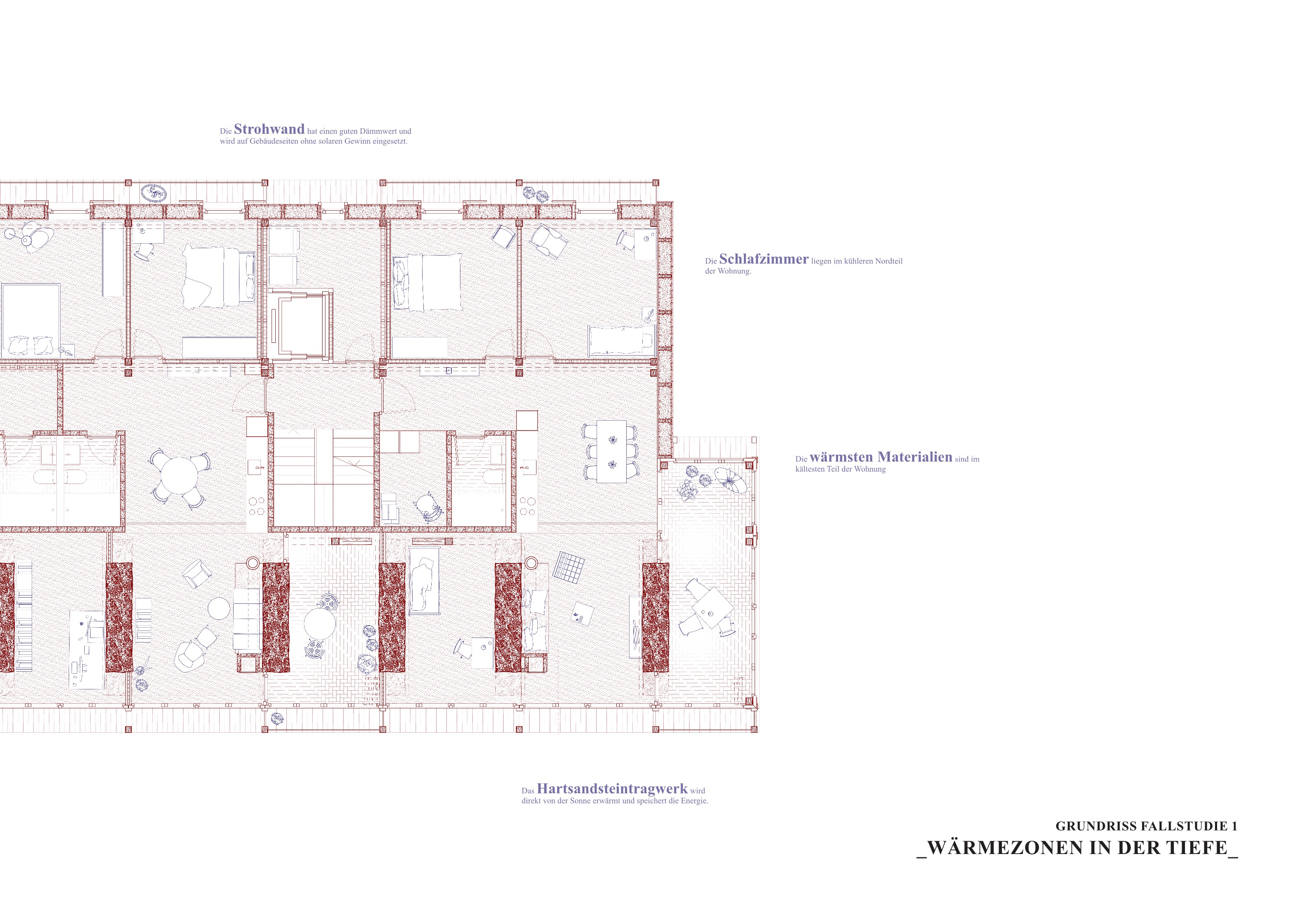 Die Masterthesis befasst sich mit der weiterführenden Fragestellung, für Wohngebäude mit hoher Speichermasse die Erstellungsenergie auszuloten. Es wird nach einer Bauweise gesucht, welche einen moderaten CO2-Verbrauch aufweist und so die kostbare Energieeinsparungen im Betrieb nicht durch einen erhöhten Bedarf an grauer Energie wieder zunichte macht. Hierfür sollen entsprechend dem Motto des "Nullkilometerhaus" konsequent Materialien bevorzugt werden, welche bei Rohstoffgewinnung, Verarbeitung und Transport möglichst wenig Energie verursachen. In einem Entwurf für eine Wohnüberbauung in Winterthur Seen wird das Thema anhand drei exemplarischer Fallstudien ausgelotet und anschaulich dargelegt. Mit einer sorgfältigen Moderation der Verarbeitungs- und Transportenergie werden dem Entwurf konsequent lokal verfügbare Materialien und Technologien zugrundgelegt. Aus den drei Fallstudien besonders hervorzuheben ist das Wohnen mit massiven Sandsteinpfeilern, welche Energie speichern und der Wohnung zugleich eine reizvolle architektonische Prägung verleihen. Zusammen mit den tiefen Grundrissen, welche die Wintersonne bis weit in die Wohnungen leiten.