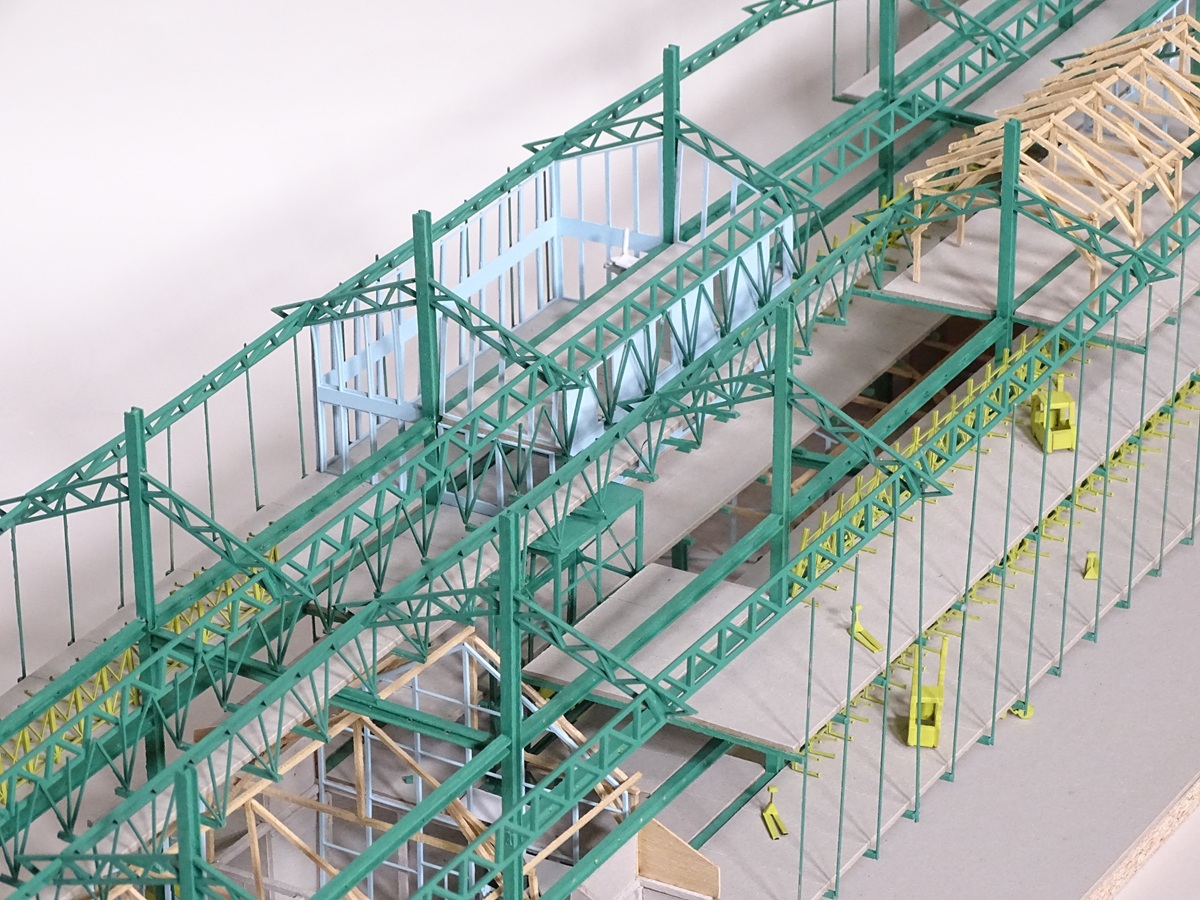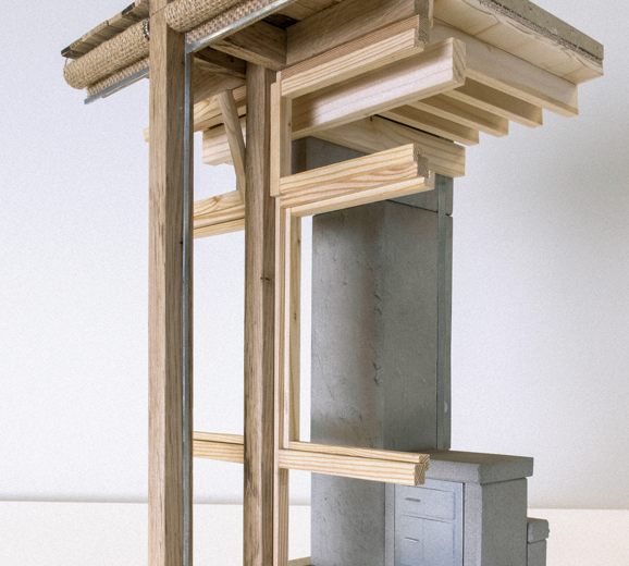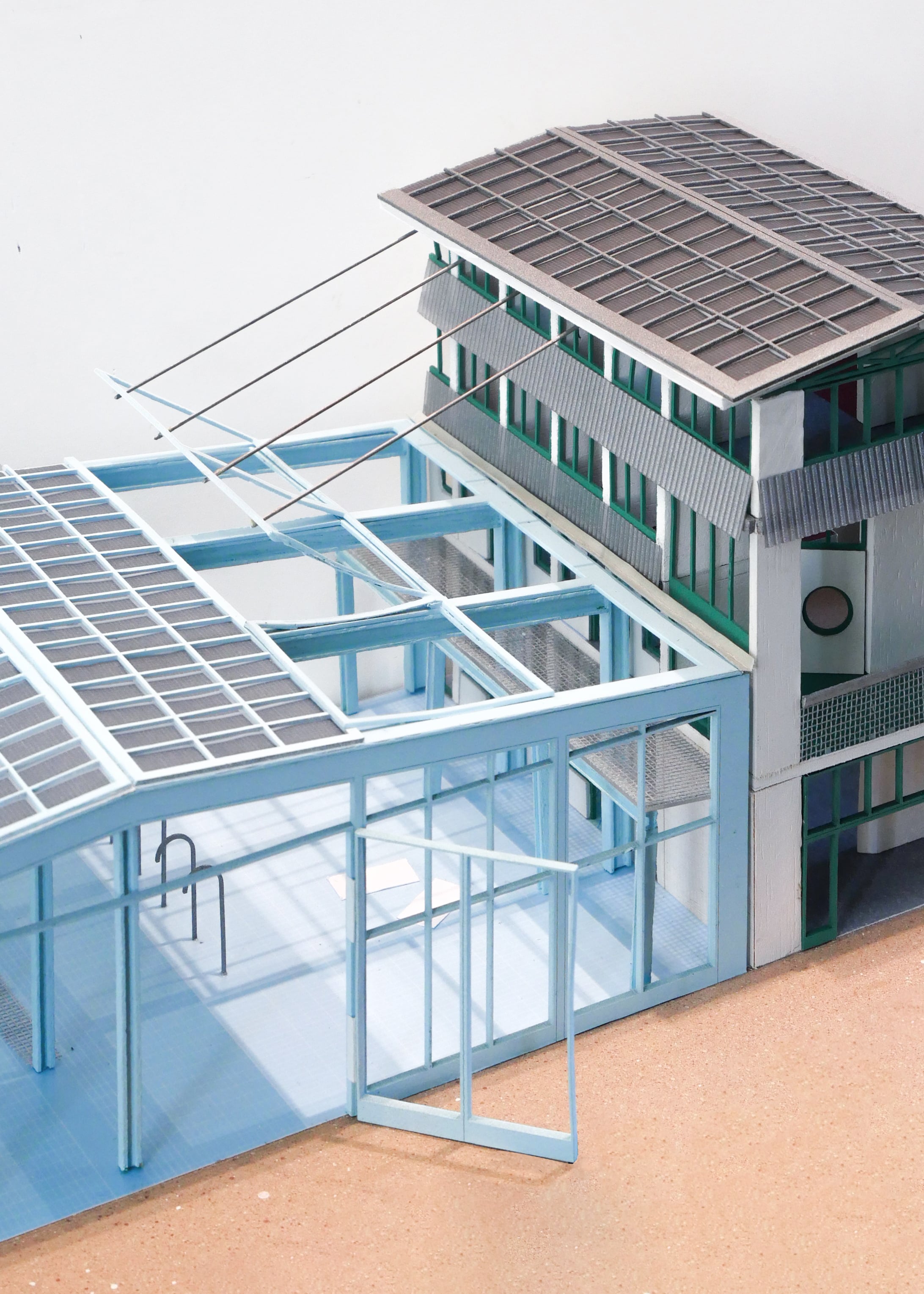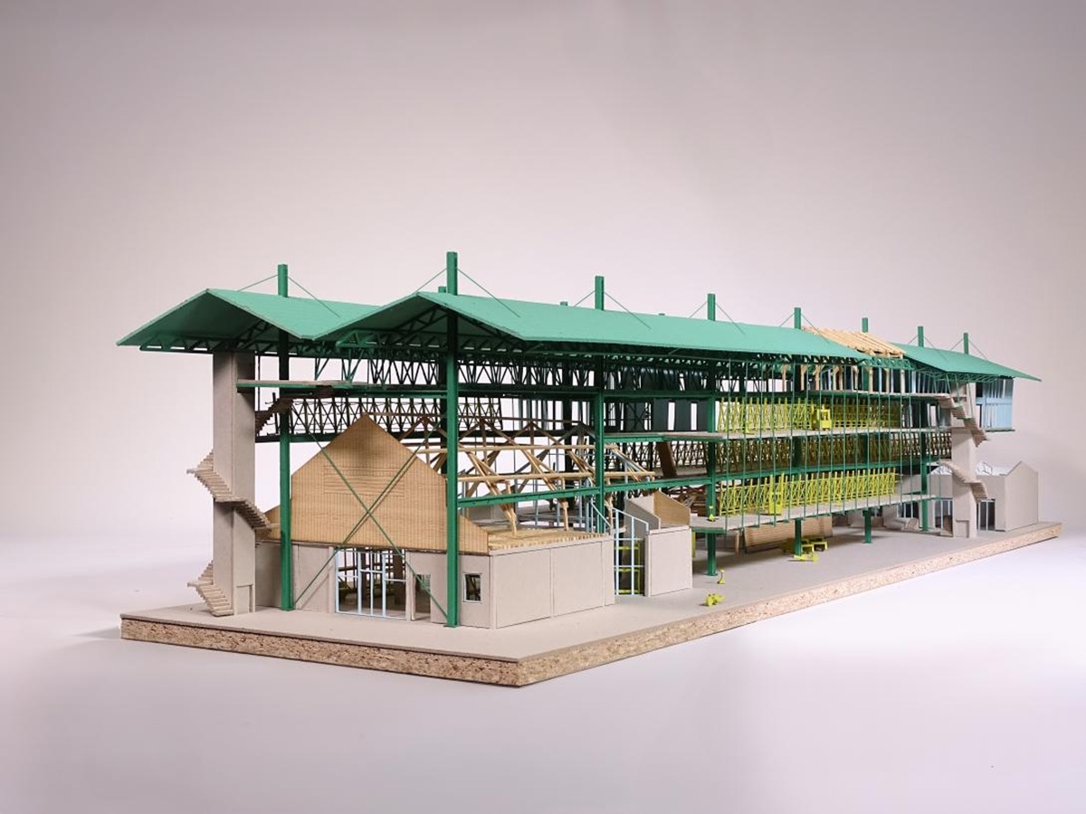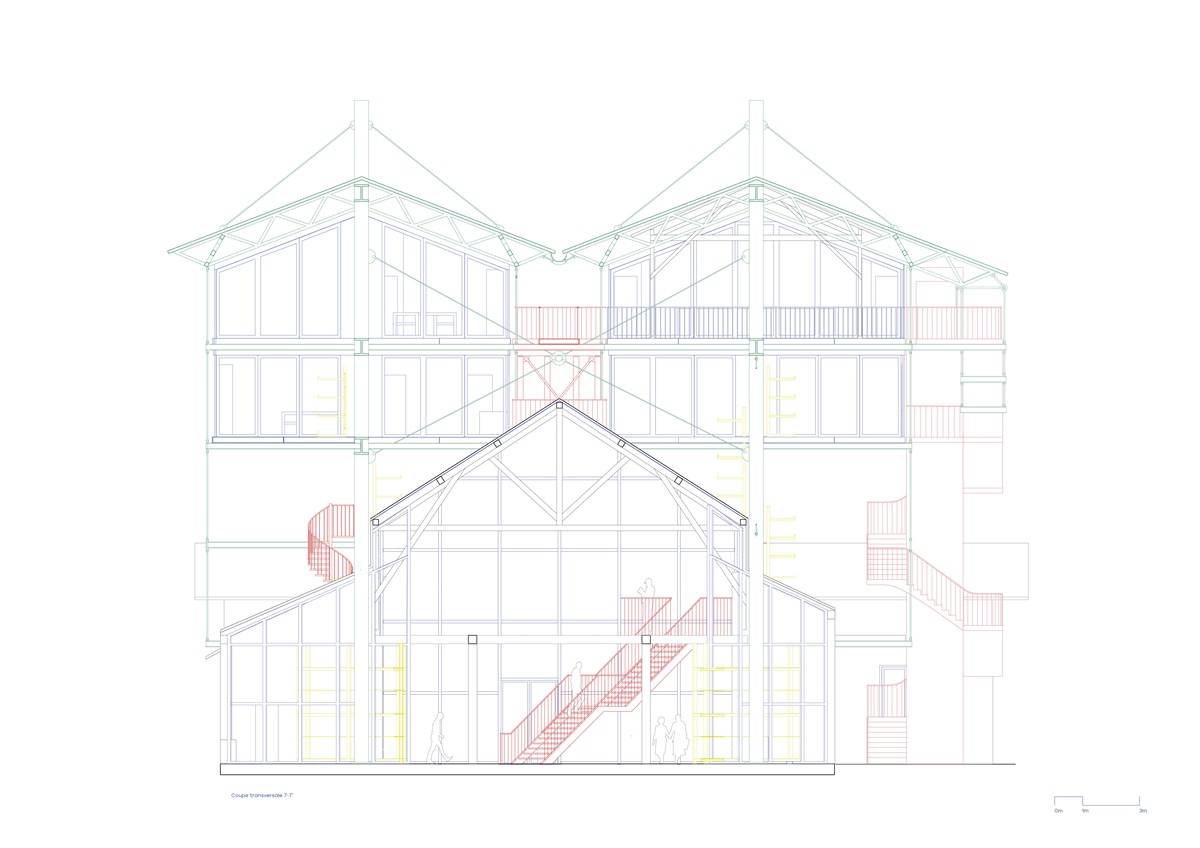 Wie sieht die Zukunft der Fabrik und ihr Image im städtischen Umfeld aus? Im Stadtteil Sévelin in Lausanne, der heute weitgehend vom Dienstleistungssektor geprägt ist, fügt sich das Projekt in die letzte Gebäudegruppe aus den 1930er Jahren ein, die an das Recyclingunternehmen Goutte erinnert. Das Programm umfasst hauptsächlich ein Zentrum für die Wiederverwendung von Bauteilen aus dem Rückbau von Gebäuden in Lausanne, was seine Lage im Stadtzentrum rechtfertigt. Hinzu kommen Wohn- und Arbeitsräume für Handwerker, die Teil einer neuen Form der urbanen, lokalen und zirkulären Industrie sind. Die architektonische Maßnahme besteht in der Installation einer Überdachung, die das bestehende Gebäude schützt. Ihre modulare Struktur erstreckt sich punktuell um die Hallen herum, was einen schrittweisen Bau ermöglicht. Dieses Gitter, das wie ein großes Regal wirkt, gewährleistet den reibungslosen Ablauf des Programms und steht gleichzeitig im Dialog mit dem umgebenden Kulturerbe. Könnten Wiederverwendung und Industrie so das Stadtzentrum wiederbeleben?