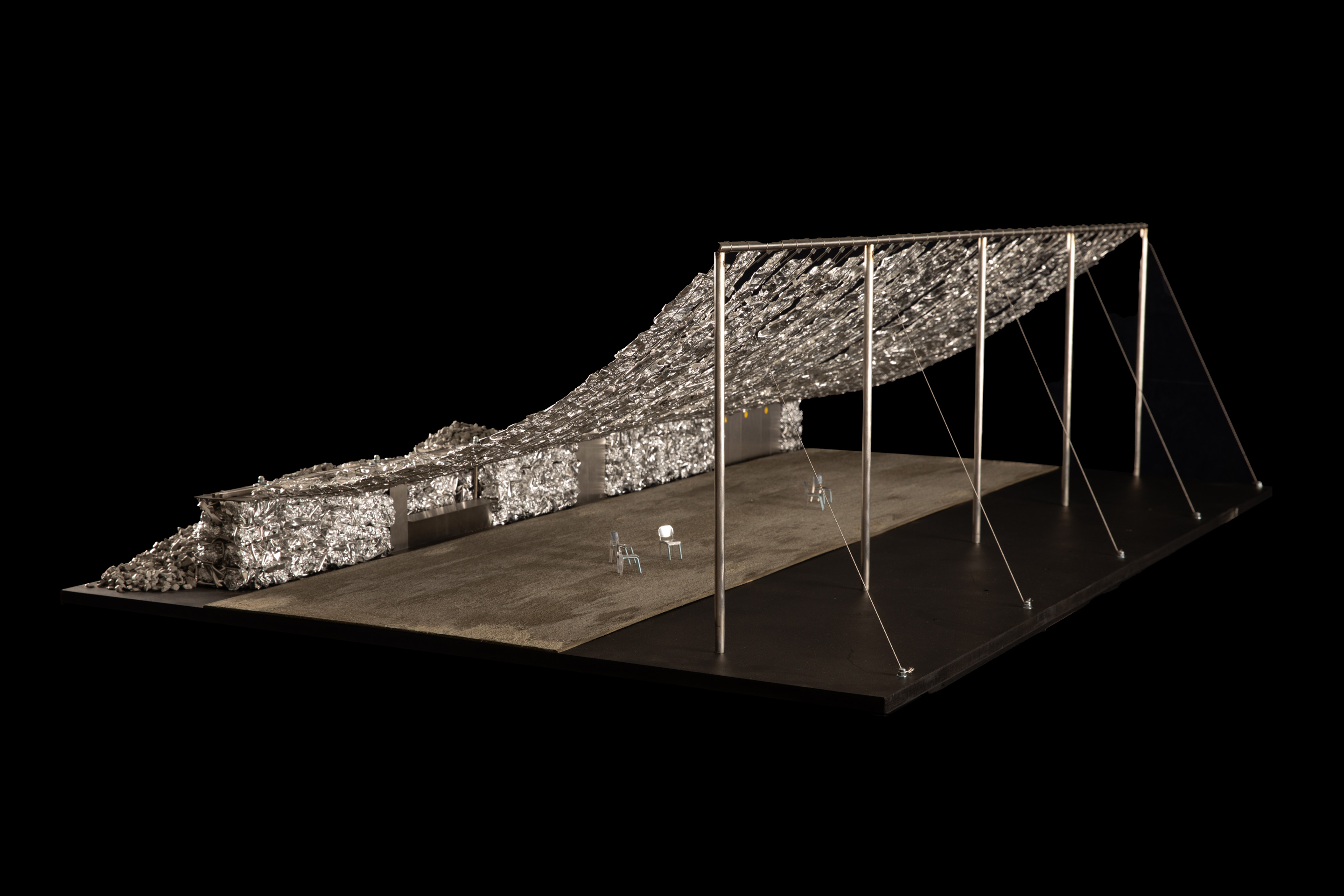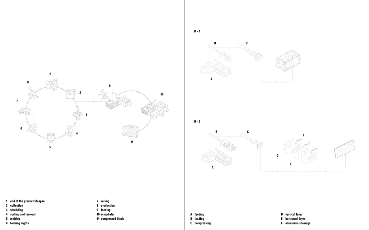 This thesis project explores how industrial byproducts can be repurposed architecturally without relying on energy-intensive recycling. This investigation raised the question: could the strongest form of aluminium exist – in its scrap state – without the need for melting? Discarded scrap was catalogued by size, shape, and thickness. This classification sparked the search for a low-energy method of recombination. Compression emerged as the key: by pressing scraps, blocks could be formed while saving up to 98% of the energy compared to melting, thus pausing the material cycle rather than continuing it. This process produced a lightweight, high-performance panel made entirely from scrap. The next step was to test how these blocks and panels could be combined into a cohesive structural system. The result was a design language uniting mass and lightness within a single constructive strategy. This project addresses a global challenge – the accumulation of industrial byproducts – and reframes it as an opportunity for architectural innovation.