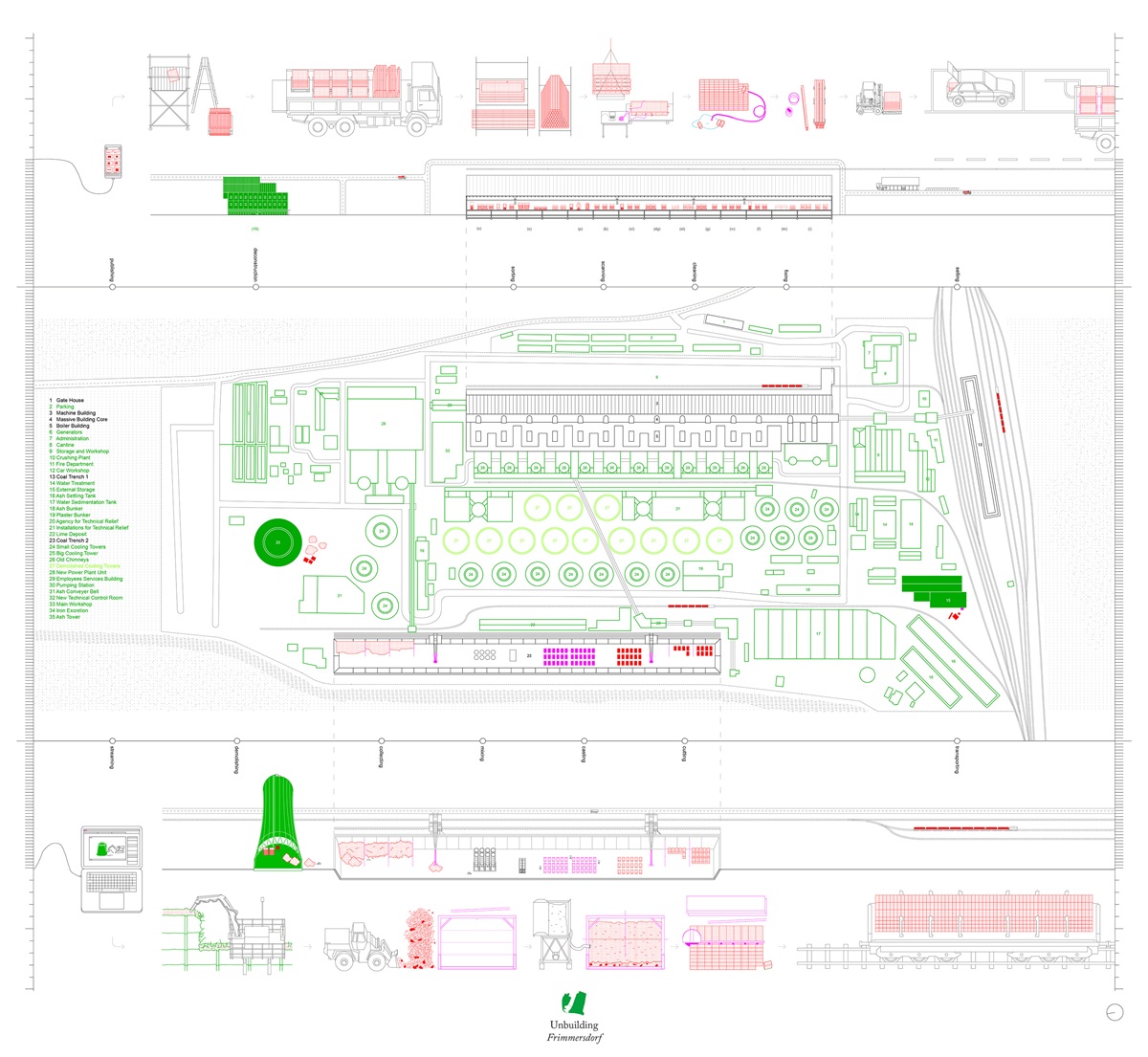 In Germany, the energy transition is ending decades of coal extraction. This leaves our generation with obsolete infrastructures, devastated land, and unsolved responsibilities. Pass This On investigates how to communally inherit ruins of extraction and reclaim potential resources. Through Protocols and Fictions, three case studies imagine possible futures for the Rheinisches Revier: Unbuilding the obsolete power plant Frimmersdorf proposes a process of careful dismantling and sorting, offering an alternative to demolition and capitalist redevelopment. The ruin becomes a shared resource, facilitating reuse practices. Reactivating the abandoned village of Bürgewald replaces plot boundaries with public grounds and land trusts. To counter speculation and sprawl, backyard extensions evolve into a systematic renovation tool to densify, expand, and connect the existing. Hijacking the last extraction site at Manheim recodes extraction machinery and ground water pumps to prepare for wetland ecologies. This post-natural landscape follows non-human timescales detached from speculative lake futures.