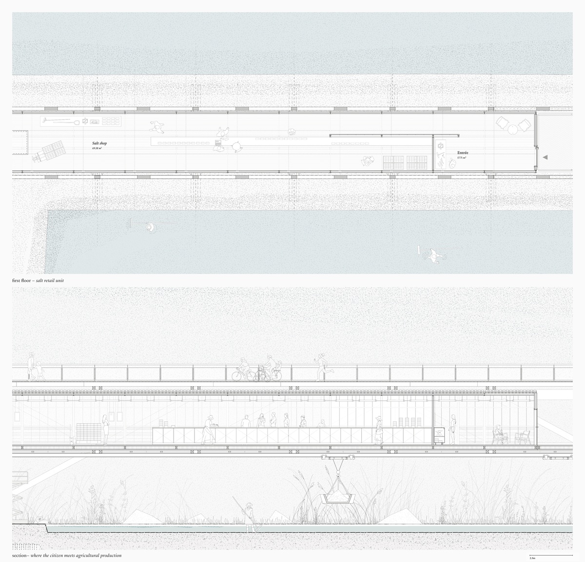 Wie sieht die Zukunft der Fabrik und ihr Image im städtischen Umfeld aus? Im Stadtteil Sévelin in Lausanne, der heute weitgehend vom Dienstleistungssektor geprägt ist, fügt sich das Projekt in die letzte Gebäudegruppe aus den 1930er Jahren ein, die an das Recyclingunternehmen Goutte erinnert. Das Programm umfasst hauptsächlich ein Zentrum für die Wiederverwendung von Bauteilen aus dem Rückbau von Gebäuden in Lausanne, was seine Lage im Stadtzentrum rechtfertigt. Hinzu kommen Wohn- und Arbeitsräume für Handwerker, die Teil einer neuen Form der urbanen, lokalen und zirkulären Industrie sind. Die architektonische Maßnahme besteht in der Installation einer Überdachung, die das bestehende Gebäude schützt. Ihre modulare Struktur erstreckt sich punktuell um die Hallen herum, was einen schrittweisen Bau ermöglicht. Dieses Gitter, das wie ein großes Regal wirkt, gewährleistet den reibungslosen Ablauf des Programms und steht gleichzeitig im Dialog mit dem umgebenden Kulturerbe. Könnten Wiederverwendung und Industrie so das Stadtzentrum wiederbeleben?