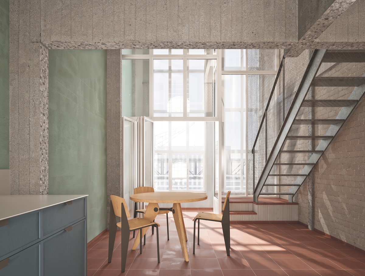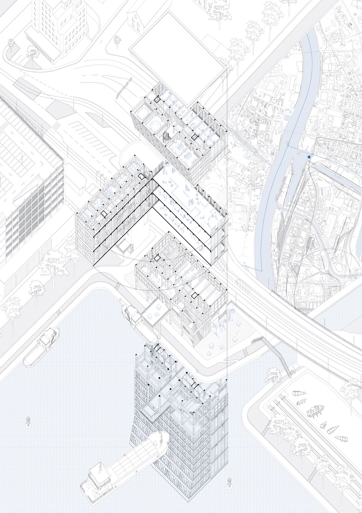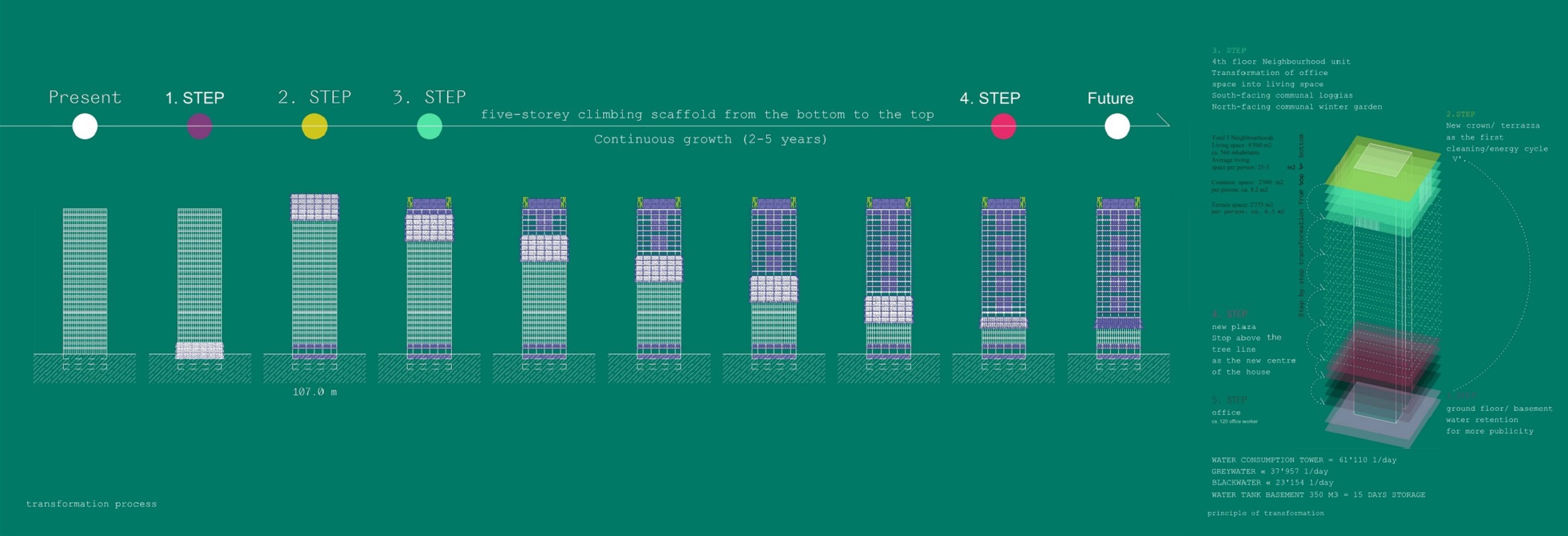 High-rise buildings symbolise modernity, represent economic prowess and technological accomplishments, but must adapt to evolving social and ecological imperatives. The Sulzer high-rise, constructed as an office tower, portrayed an emblem of industrial affluence. Today, it epitomises the challenge of reimagining such monofunctional edifices for the future. The foundation for this project lies in its façade framework: it reemerges as an architectural device—the tower does not evolve from the bottom up, rather from top to bottom, mimicking a plant whose roots gradually burrow down. A steel skeleton structure reconfigures the office interiors into residential units. The transformation is also defined by principles of the circular economy: rainwater and grey water are reutilised on-site. Could this principle serve as a prototype for confronting the limitations of monofunctional office towers? Could it give rise to a system that redefines existing urban fabrics, and inspires other cities as a didactic scaffold for the future?