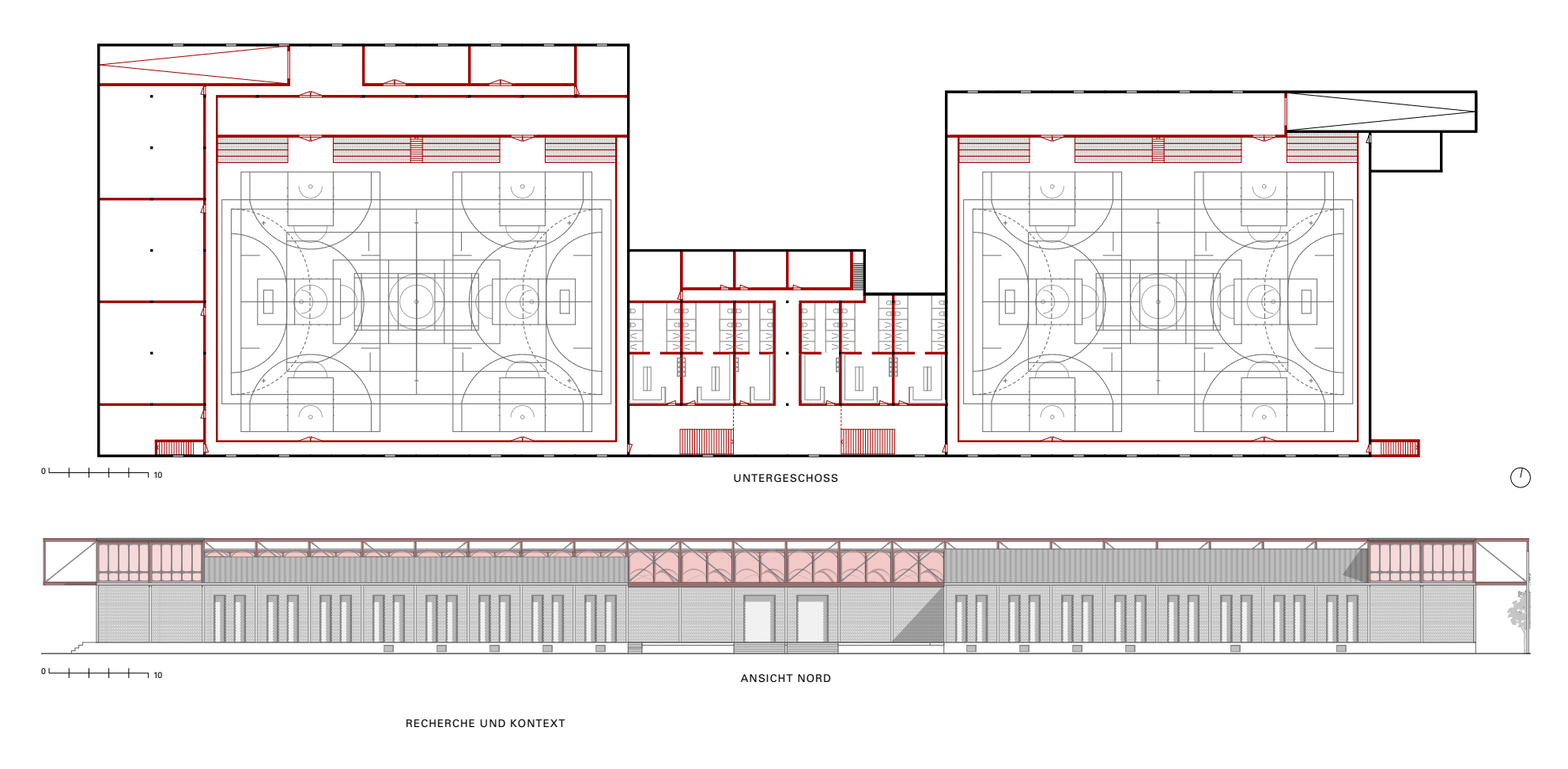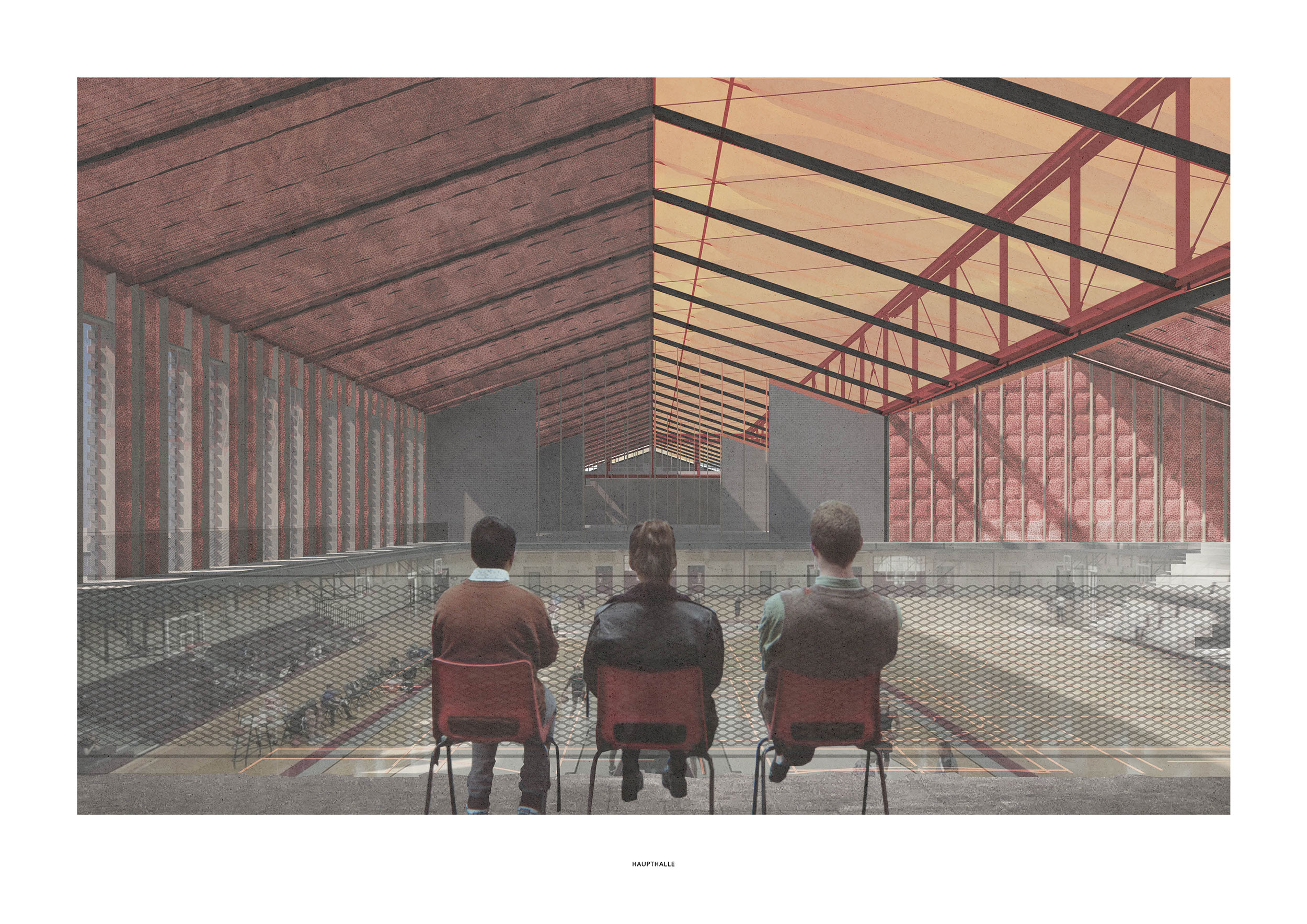 Anstatt einer neuen Sporthalle soll für den Turnverein Füllinsdorf bei Basel eine Logistik- und Lagerhalle umgebaut werden. Das Projekt soll eine Schnittstelle zwischen dem Sportverein als gesellschaftsbildender Institution und der Rheinstrasse als öffentlichem Raum bilden und so zur Entwicklung der Region beitragen. Das Gebäude wird entsprechend den verschiedenen Nutzungen in klimatische Zonen aufgeteilt: Räume mit erhöhtem Wärmebedarf, solche, die mit einer tieferen Raumtemperatur betrieben werden können und solche, die gekühlt werden müssen. So werden die Umkleiden mit Warmwasserspeichern durch solarthermische Anlagen beheizt. Zur Dämmung wird eine leichte, textile Hülle auf einer Holzständerkonstruktion eingeführt. Eine Pelletheizung erbringt die fehlende Heizleistung mithilfe einer Verdrängungslüftung, wenn solare und interne Einträge nicht vollständig für die Erwärmung des Gebäudes aufkommen können.