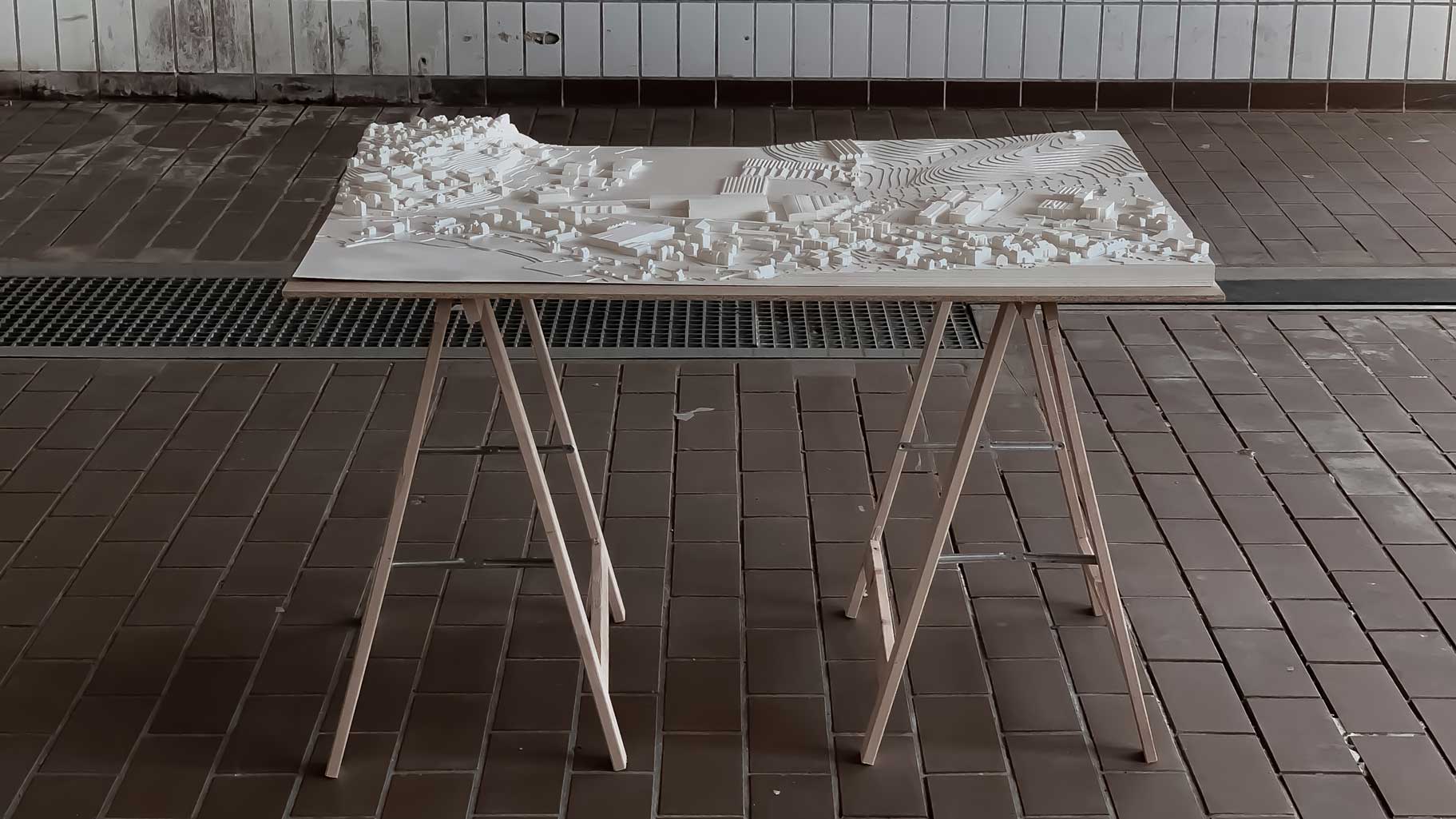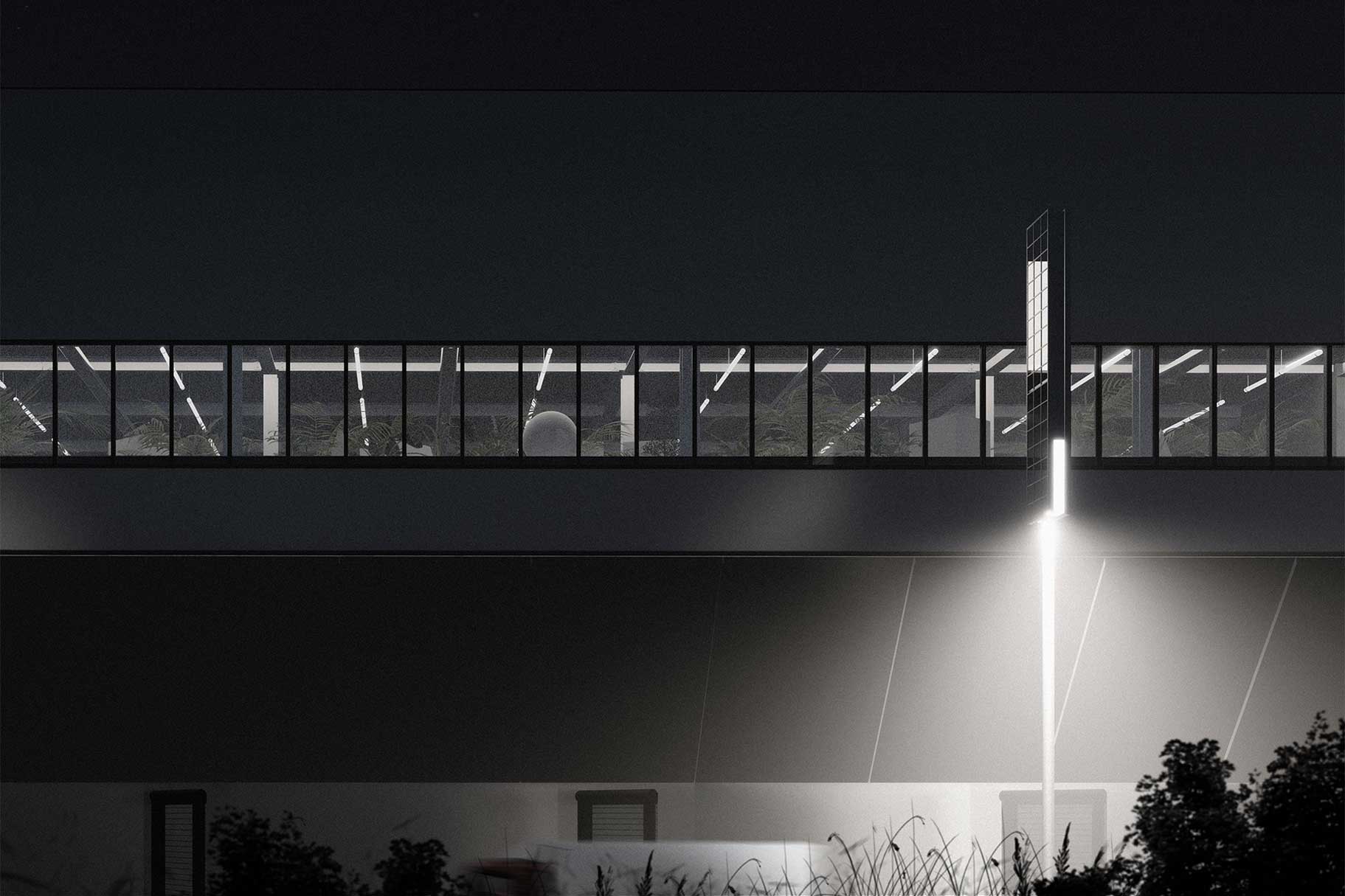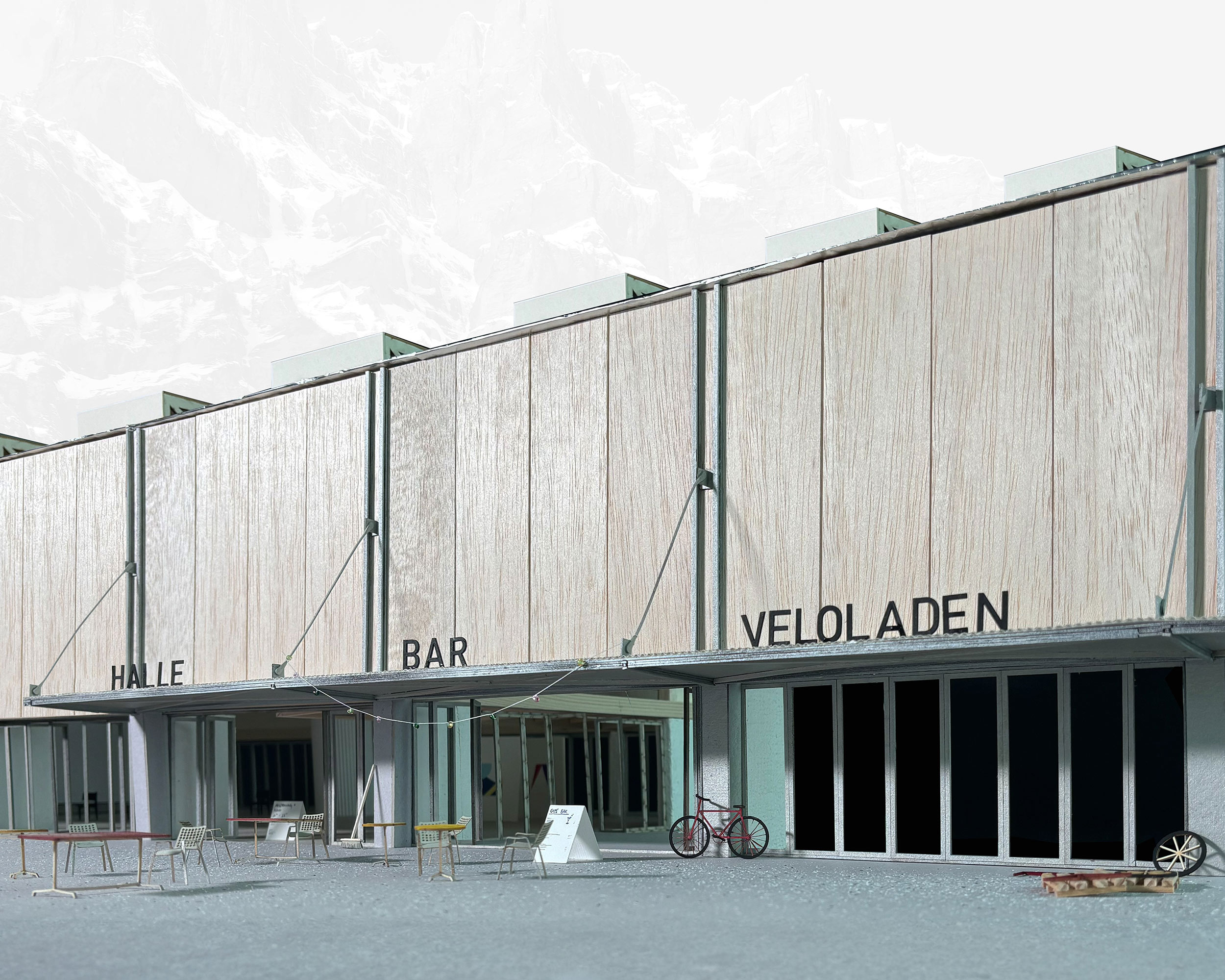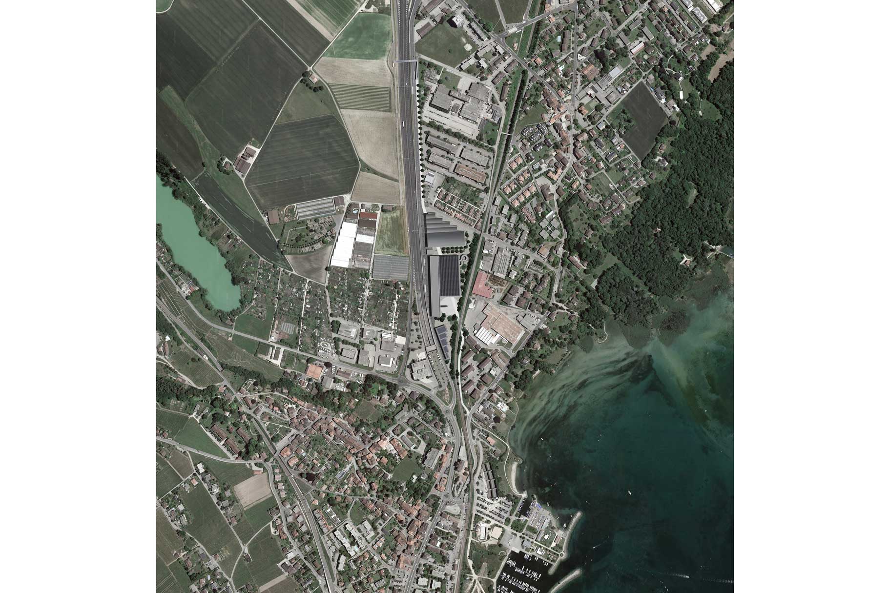 In der Peripherie von Neuenburg sollen bestehende Gewerbehallen umgenutzt werden. Der Standort in einem anonymen Industriegebiet neben der Autobahn ist eine Herausforderung. Der Verfasser schlägt vor, einen bestehenden Hallenkomplex um neue Elemente zu ergänzen und darin Wohnungen sowie Büros unterzubringen. Interessant ist die Idee, einen Veloweg als Langsamverkehrsachse durch die grossvolumigen Hallenbauten hindurchzuführen.