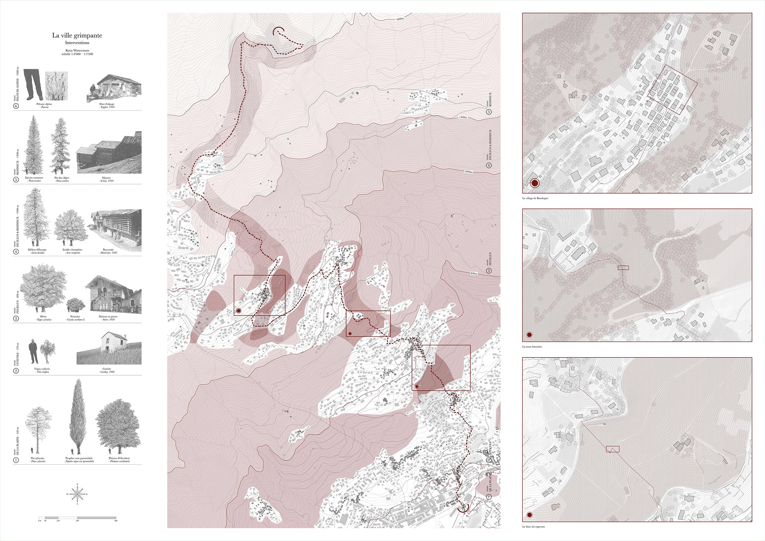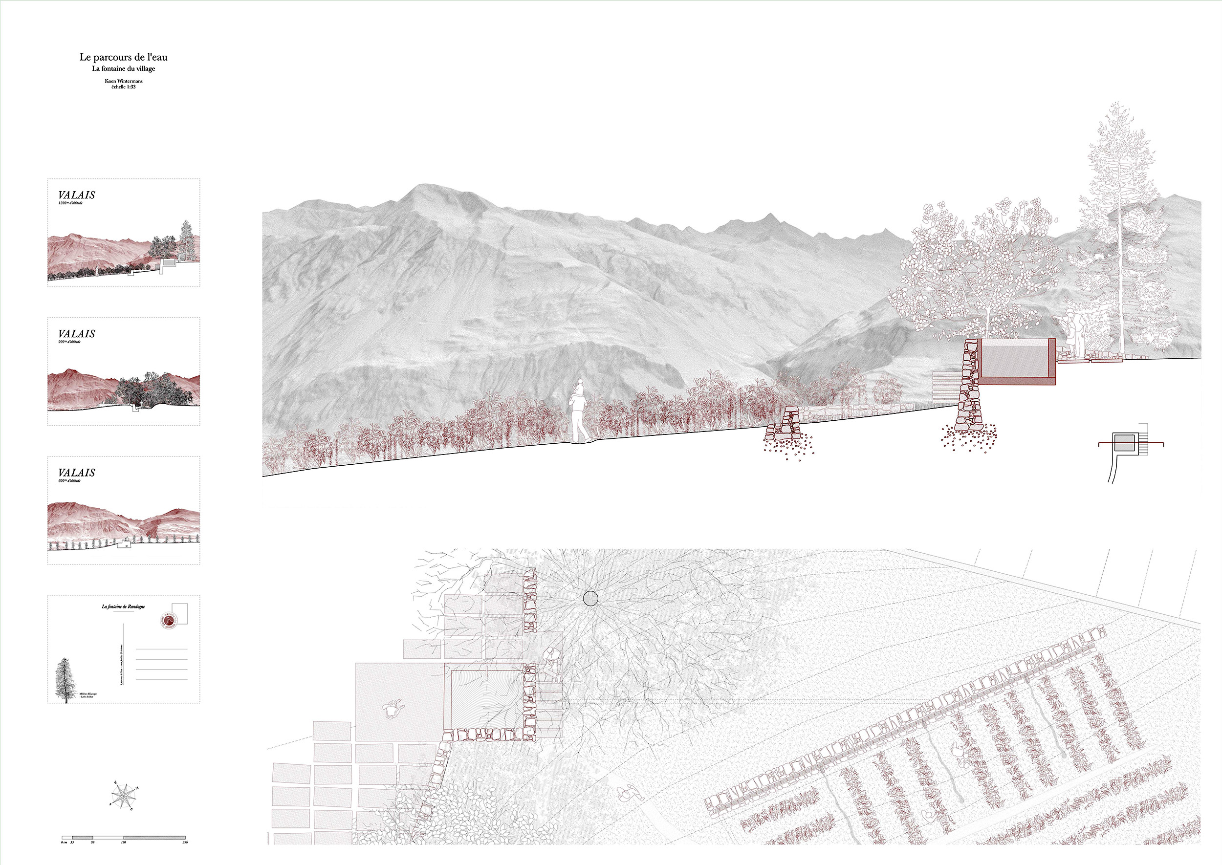 Ce mitage auquel l'auteur va donner une réponse à travers un projet qui parcourt le territoire de bas en haut. Un parcours qui remet en jeu le paysage par le biais d’un ancien tracé. Un tracé qui reconnecte les strates paysagères entre elles pour former un tout. Un tout indissociable qui concilie paysage et bâti, tradition et modernité.