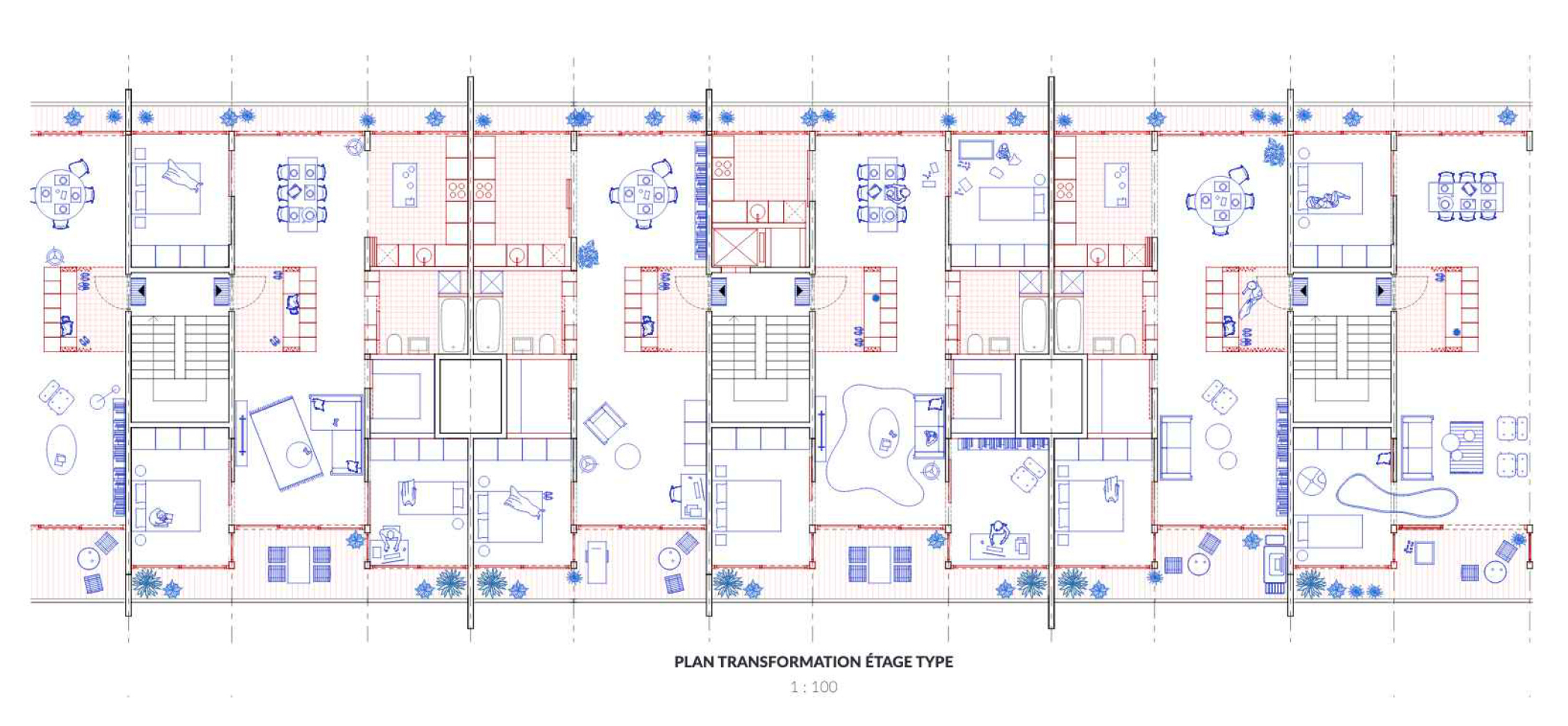Le projet s’inscrit dans le centre haussmannien de Paris, qui, par son histoire, a su démontrer sa capacité à absorber les grandes mutations démographiques. Le site se compose d’un ensemble d’immeubles haussmanniens au centre duquel un garage des années 1960 offre une typologie unique et devient ainsi à l’origine d’une hybridation à amplifier. Un environnement domestique inclusive et « dénormée » est proposé, qui s’étend à la fois dans les appartements haussmanniens et sur les plateaux de l’ancien garage. « Cellule », « Cluster » ou « Plateau », offrent des espaces aux rythmes de tous, en réponse à des temporalités différentes. Au sein des immeubles haussmanniens, les clusters visent à expérimenter des interactions augmentées, gravitant autour d'usages fondamentaux largement partagés. La maison est revendiquée ouverte et les différentes durées d’occupation, ainsi que la forte densité générée, trouvent place dans une matrice d’espaces à envahir. La densité haussmannienne et l’immatérialisme du plateau sont amplifiés et déforment les codes domestiques au profit d’espaces et d’objets qui deviennent les nouveaux lieux publics du logement générant des situations inattendues et des dispositifs novateurs. La mutation de nos contextes et les mouvements démographiques qui l’accompagnent, deviennent une des clés à la conception de nouvelles manières d’habiter. Le projet considère l’architecture de la « maison » comme un espace de modification des comportements sociétaux.