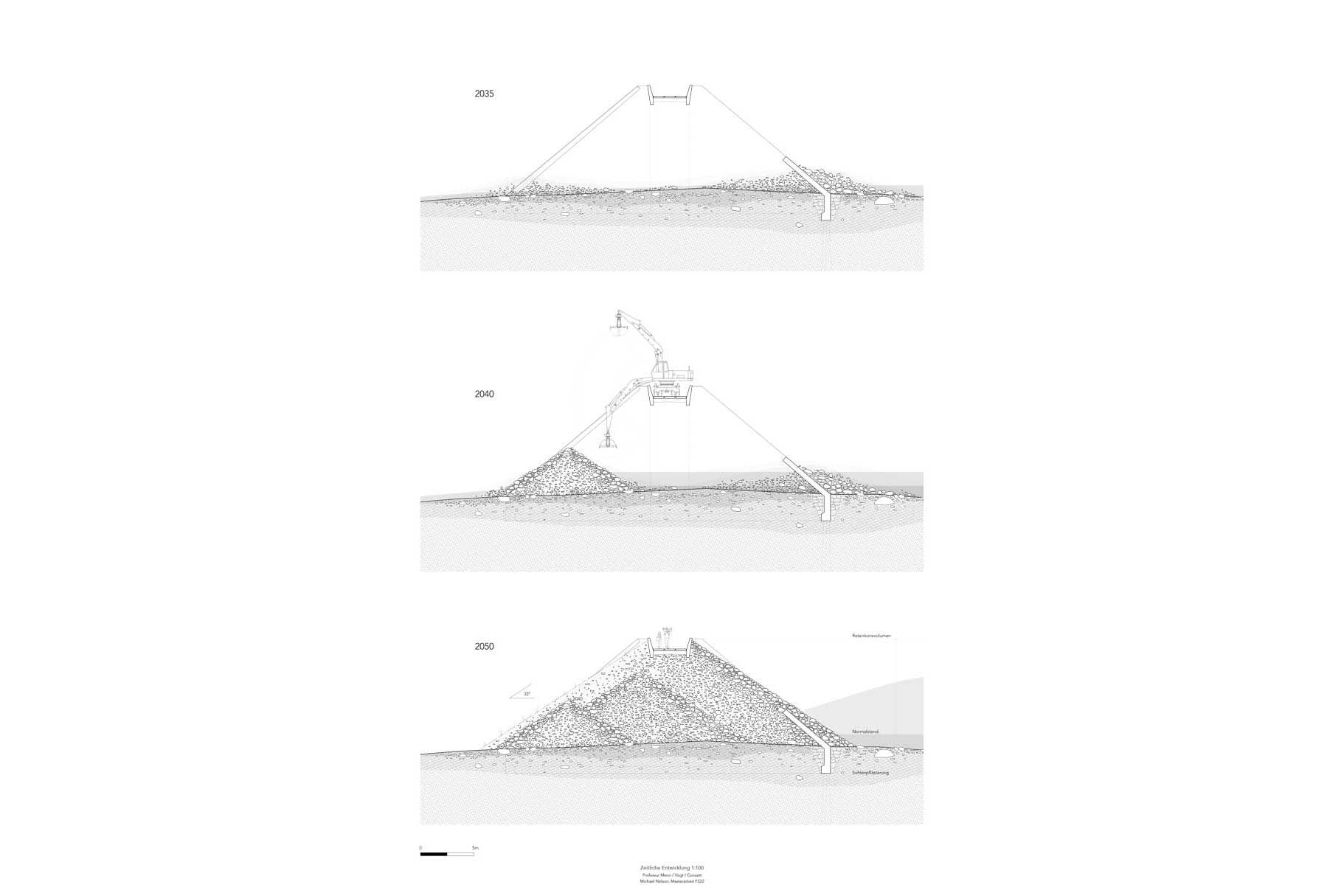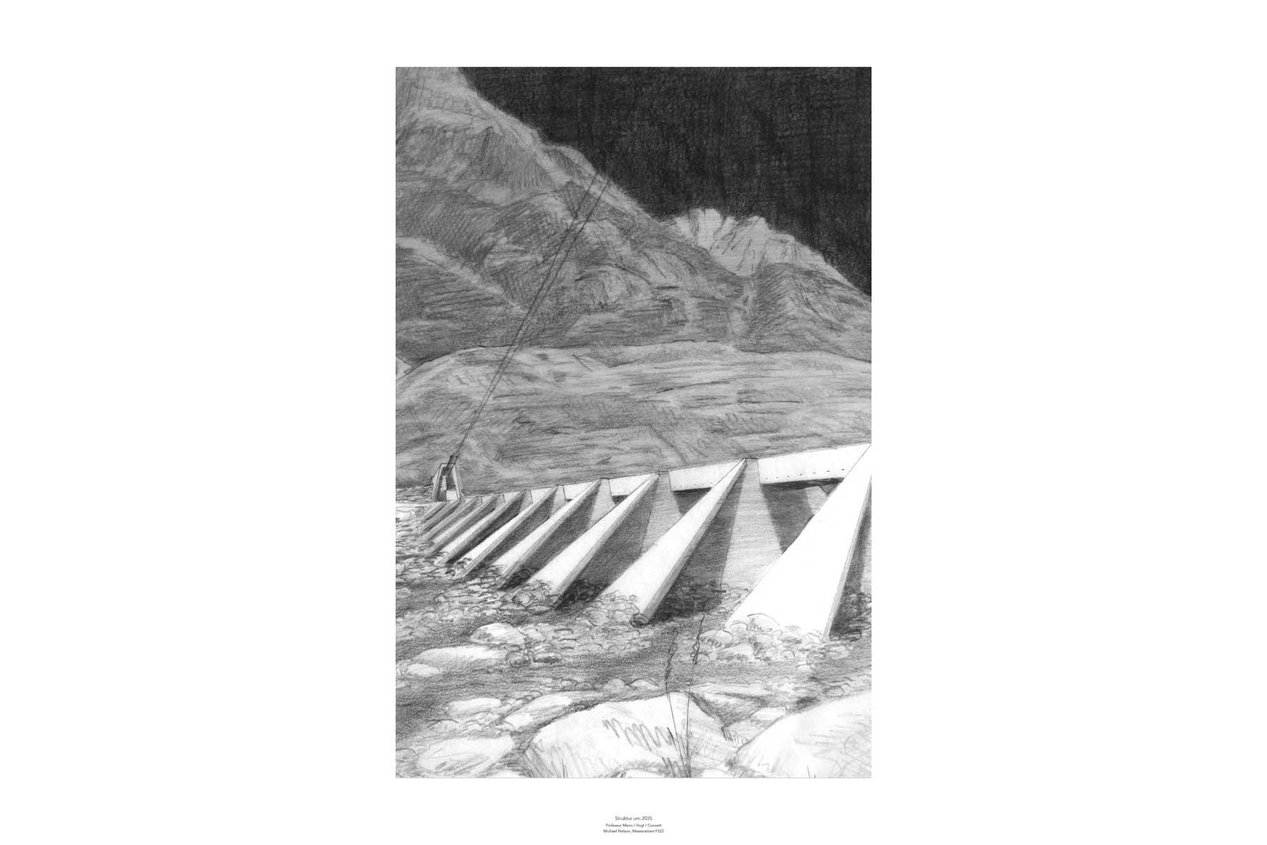 Die vorliegende Arbeit verbindet gleich mehrere Themen: Bauen in den Bergen, Infrastruktur, Folgen des Klimawandels und Landschaftsarchitektur mit einem für statische Bauwerke eher ungewöhnlichen Aspekt: der kontinuierlichen Veränderung. In einem Walliser Bergtal zieht sich der Gletscher zurück und hinterlässt dabei Seen im Geröll. Letzteres droht abzurutschen, was die entworfene, grossmassstäbliche Hilfskonstruktion verhindern soll. Zwölf Z-förmige Elemente in Talrichtung sollen dabei wie eine Art Rechen das Geröll abfangen, das Wasser aber abfliessen lassen. Durch den Geröllabgang baut sich der Staudamm mit der Zeit auf beziehungsweise wird mithilfe eines in das Projekt integrierten Kransystems aufgetürmt. Die für den Bau benötigte Seilbahn soll später den Wandernden dienen.