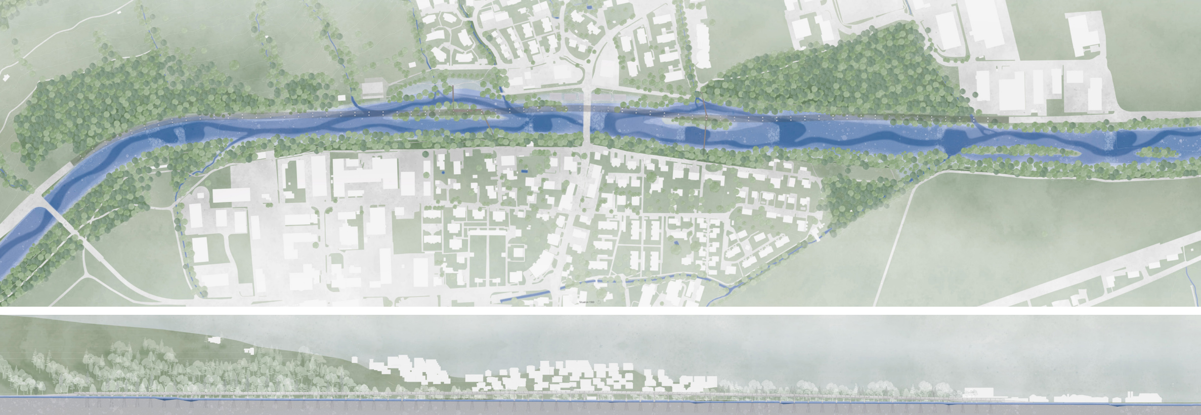 This project questions how to stage movement – and life – in urban space. The project proposes to revitalise the Veveyse torrent by giving it back the unbuilt spaces it used to flow through before industrialisation; by redesigning the branches proper to its morphology, rebuilding the banks that once created different types of relations between water and city, and reopening the Monneresses, two branches that would again serve as urban promenades. The former Veveyse delta is designed as an urban park, capable of supporting different forms of life and connecting different urban tissues. Through a walk from vineyards to lake, the project reinvents the procession that was at the origin of the «Fête des Vignerons» and interprets the idea of Festspiel not only as an event that happens across generations, but as a way of animating everyday stages through movement. The succession of these stages rhythmises the movement along the park and anticipates the steps on the place du Marché, which open onto the water stage and the mountain scene.